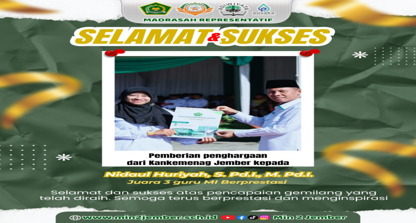 MIN 2 berinovasi dalam menghadirkan pendidik yang tidak hanya mengajar, tetapi juga menginspirasi melalui prestasi dan dedikasi nyata. Dalam rangka memperingati Hari Amal Bakti (HAB) Kementerian Agama Republik Indonesia ke-80, penghargaan dari Kankemenag Jember ini menjadi bukti bahwa kerja keras, keikhlasan, dan komitmen dalam dunia pendidikan akan selalu menemukan jalannya untuk diapresiasi.
